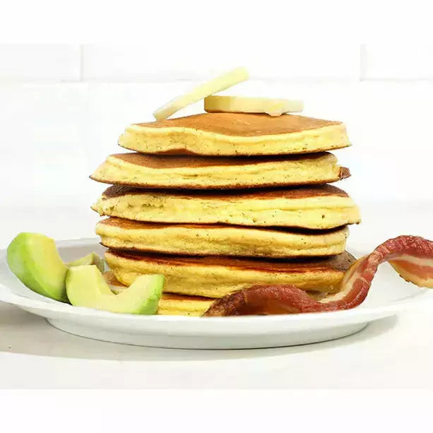 Estos panqueques cetogénicos cumplen con sus macros, con solo 5 g de carbohidratos netos por porción para que pueda disfrutar nuevamente de su desayuno favorito. Hemos creado las tortitas del futuro. Esperamos que no se rebelen contra la humanidad.